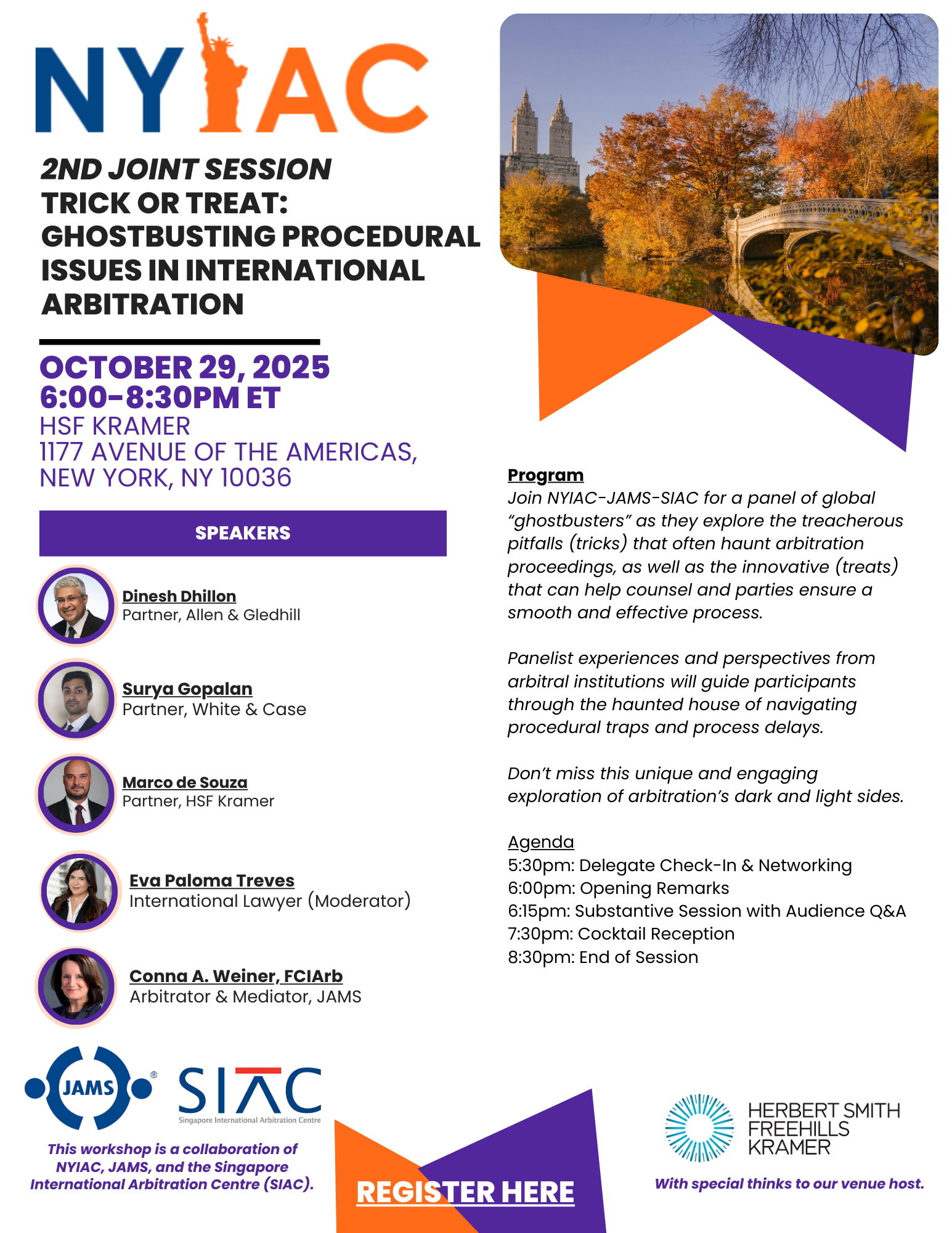 Join the New York International Arbitration Center (NYIAC), JAMS, and Singapore International Arbitration Centre (SIAC) for a panel discussion with global “ghostbusters” as they explore the treacherous pitfalls (tricks) that often haunt arbitration proceedings as well as the innovative (treats) that can help counsel and parties ensure a smooth and effective process.